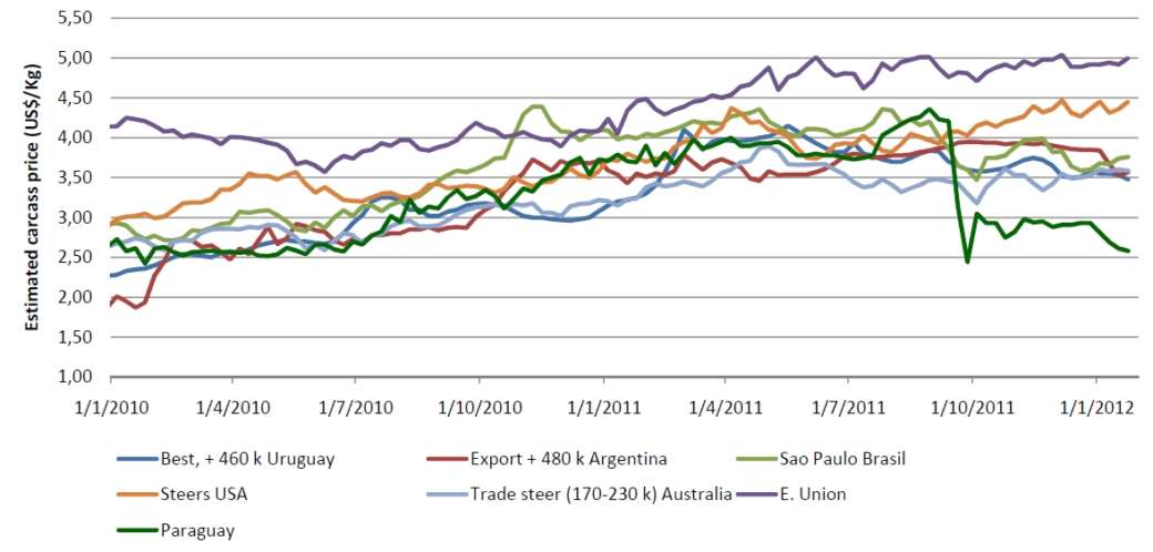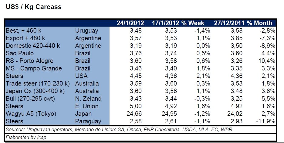 Na tabela abaixo observam-se os preços do boi gordo no período de trinta dias nos principais países produtores, de 27/dez/11 a 24/jan/12.