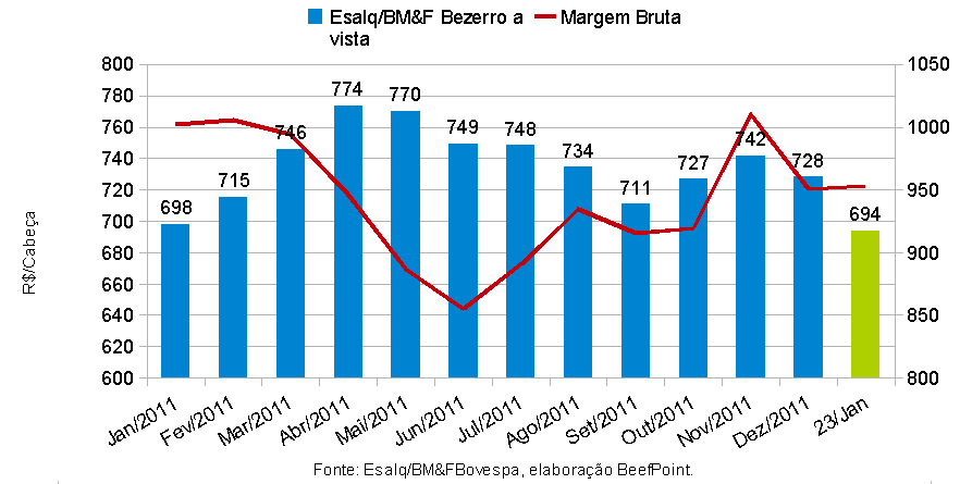 Gráfico 1. Indicador Esalq/BM&FBovespa bezerro à vista x margem bruta