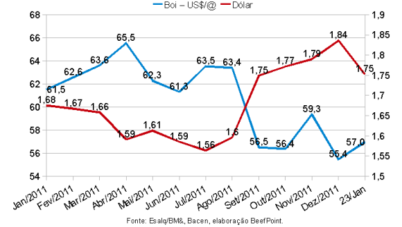 Boi Gordo: seca de 2011 reduz oferta de animais nos Estados Unidos, maior produtor mundial, abrindo espaço para o Brasil atender parte da demanda global. No mercado interno, preço da arroba não evolui diante da concorrente queda do valor do frango para o consumidor.
