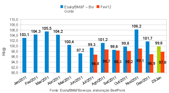O contrato futuro do boi gordo para fevereiro/12 foi negociado aR$97,78 com variação em alta de R$0,43.