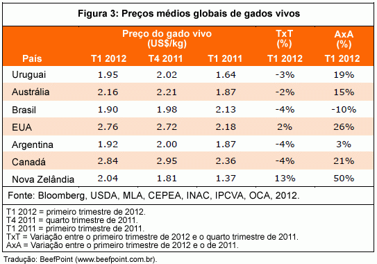 Existem riscos de pressão de baixa os preços nos mercados de gado/carne bovina durante o segundo trimestre de 2012, à medida que é esperada uma oferta global levemente maior, liderada pelo Brasil e outros países do Hemisfério Sul, em meio à economia global que permanece relativamente fraca. Para o resto do ano, entretanto, os preços do gado deverão se recuperar novamente, à medida que os mercados mudam de aumento na oferta de curto prazo (principalmente o Brasil) para ofertas materialmente menores já que a maioria dos países produtores de carne bovina está passando por liquidação, ciclo de retenção ou problemas relacionados ao clima.